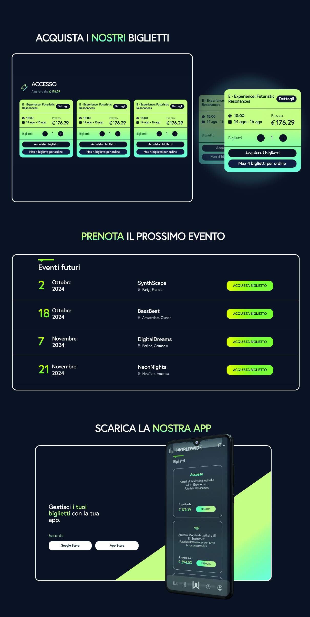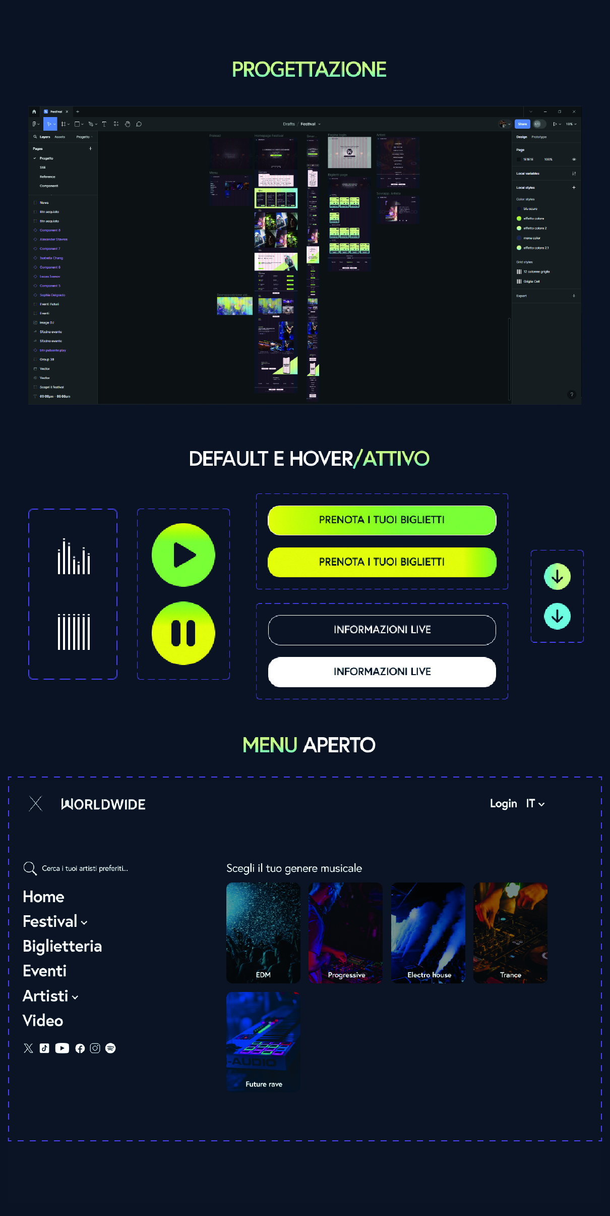 Il design del festival Worldwide è pensato per trasmettere energia e movimento, proprio come la musica che lo anima. Interfacce visive dinamiche, palette vibranti e animazioni fluide danno vita a un’esperienza digitale che riflette lo spirito globale dell’evento, trasformando il concept in un racconto visivo coinvolgente.